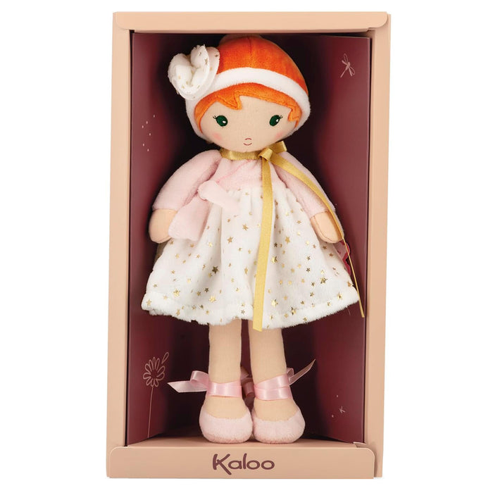 Explore the classical dancer who is the stuff of little ballet fans' dreams! Dressed in a powder pink wrap-over top embellished with a golden scarf and an oh-so-soft champagne-coloured star print skirt, Valentine reveals delicate, refined style. Her red hair distinguishes her from other Tendresse dolls. Machine washable.