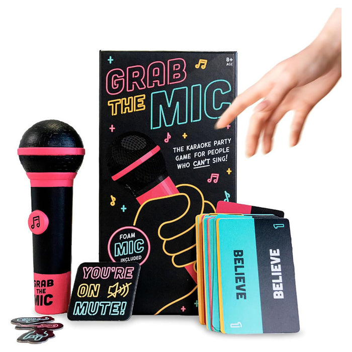 Grab The Mic is the ultimate karaoke-style game for those who love music but might not have the singing skills! Flip a card, think quickly, and race to grab the foam microphone to sing a lyric containing the revealed word. It's a fast-paced game that keeps everyone on their toes! Watch as your friends try to recall lyrics under pressure, resulting in hilarious renditions of popular songs. It's guaranteed to have everyone laughing and singing along! Featuring a game board with multiple game modes, Grab The Mic offers various levels of challenge and keeps the fun fresh every time, Switch up the board for a new experience, creating endless musical battles that never get old! Contents: 125 word cards, a foam microphone, game board, player tokens, and easy-to-follow instructions. Get your friends and family together for hours of musical entertainment with Grab The Mic!