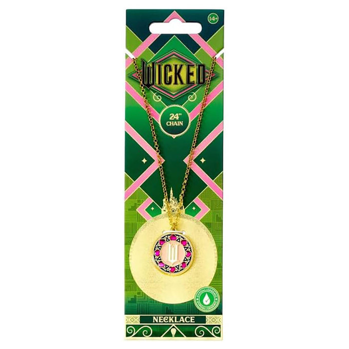 Express your passion for everything Wicked with this gold tone necklace featuring the iconic 'W' symbol. The pendant boasts a beautiful combination of pink, blue, and white enamel, surrounded by a border of heart-shaped pink crystals. Complete with a 60cm trace chain that sits perfectly on the neckline. From an officially licensed collection of jewellery, make a bold statement with this must-have piece.