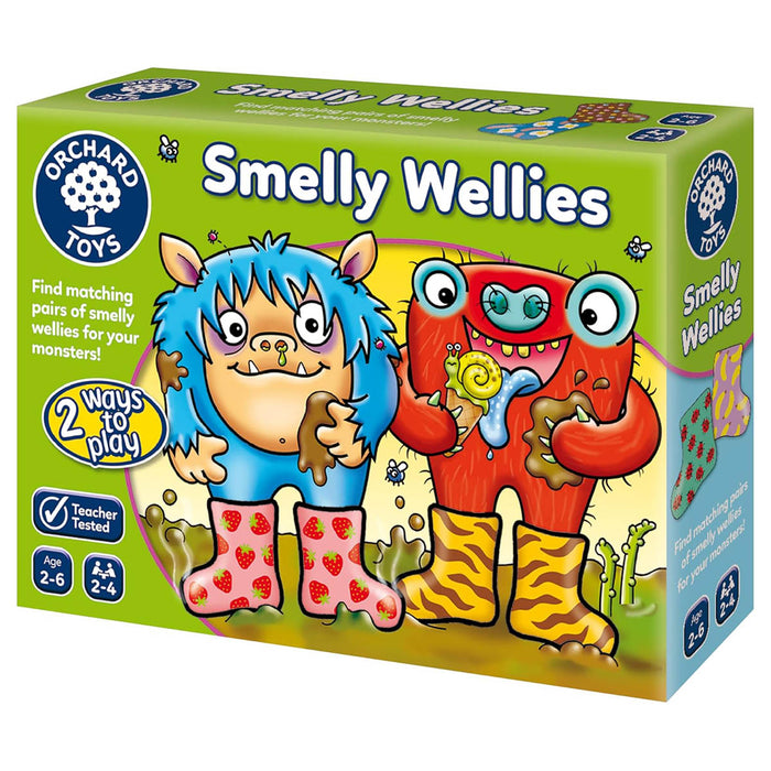 The fun and simple matching game Smelly Wellies where players turn over welly cards to find matching patterned wellies for their monsters. The quirky monster characters are bound to get children giggling!. There are two ways to play this colourful game, as a simple matching pairs game for younger players and a more challenging memory game as children progress!
