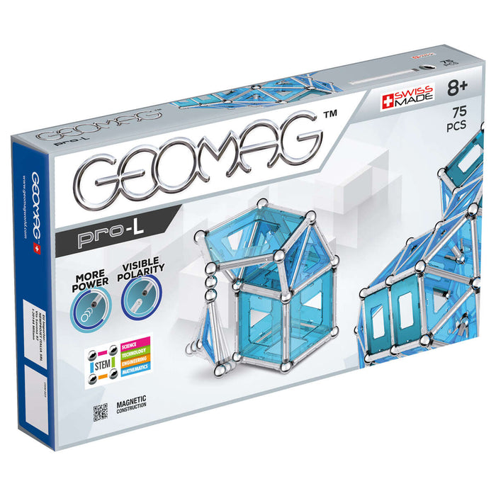 Swiss made Geomag PRO-L is the evolution of the classic magnetic construction system and uses the power of powerful magnets to allow you to build even more spectacular structures. The polarity indicator, which is shown on the rods, helps you to understand the full potential of magnetism. The silver rods and transparent panels give Pro-L a high-tech futuristic look! This STEM product is designed to encourage fine motor skills, learning by playing and creativity and imagination. Geomag is the original magnetic construction toy.