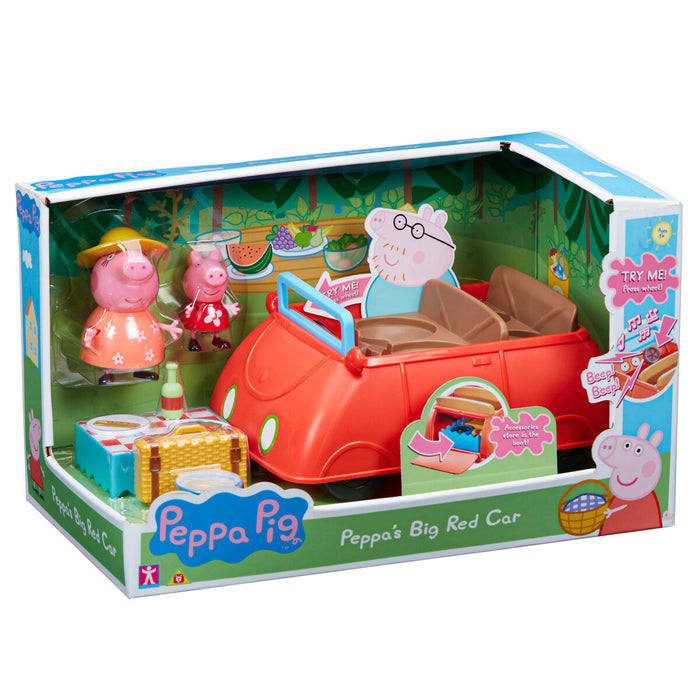 Peppa Pig Peppa's Big Red Car is everything you need for a Peppa Pig adventure! Take Peppa and Mummy Pig on a picnic trip! Press the steering wheel to hear music and sound effects! Includes picnic hamper, blanket, food, BBQ, Peppa and Mummy Pig figures. Everything stores away inside the boot! Free wheeling classic red car with room for all the family!