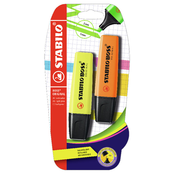 • STABILO BOSS ORIGINAL Yellow & Orange Highlighter pack of 2 are ideal for highlighting texts of various sizes as well as for drawing lines of different thicknesses.