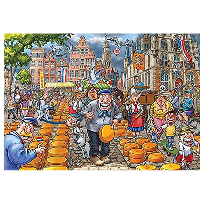 Wasgij is a unique puzzle concept that tests even the most enthusiastic puzzlers. With traditional jigsaws, the goal is to build the exact image shown on the box, but with Wasgij you must create an entirely different picture. Wasgij Original is where you have to use your imagination to piece together what the characters in the scene printed on the box are looking at. The Dutch cheese market is busier than ever, with locals and tourists alike gathering to purchase some local delicacies - even the dark clouds can’t dampen their spirits! Luckily for them, the sun has broken through the gloom and started to shine brightly on the market stalls below, but why does the sudden change in weather take everyone by surprise? That is the image you need to puzzle.