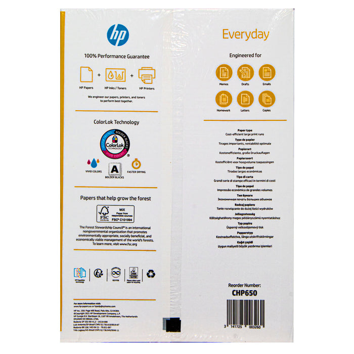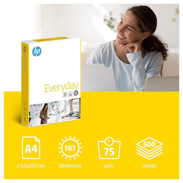 HP Everyday is a 75gsm paper, lighter and whiter than standard home and office papers and yet it still provides a rigid, solid feel. This HP multifunctional paper is ideal for daily use: HP Everyday has been optimised to offer excellent results with both inkjet and laser printers, and it is suitable for office and home use. Thanks to HP ColorLok® technology, colours are brighter, blacks are bolder. The ink dries faster to make HP Everyday paper really economical and very cost-effective. HP Everyday is the perfect choice of paper when looking for quality, reliability and sustainability. FSC and EU Ecolabel certified