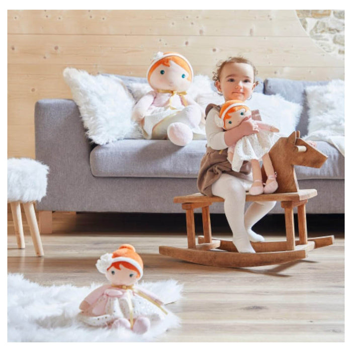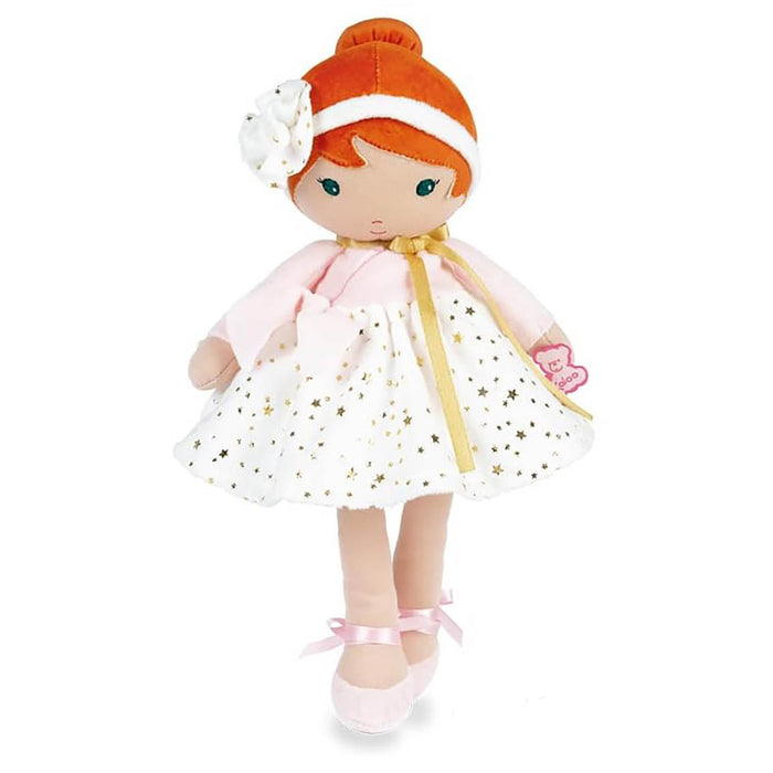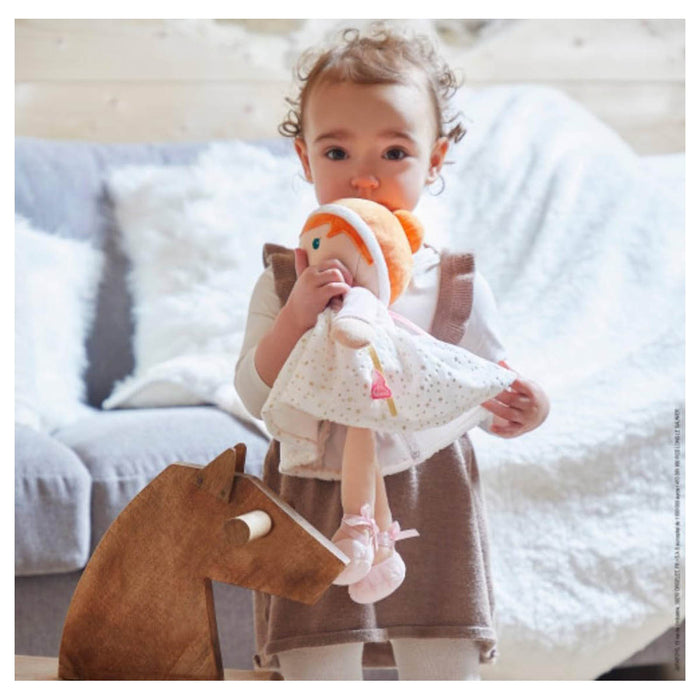 Explore the classical dancer who is the stuff of little ballet fans' dreams! Dressed in a powder pink wrap-over top embellished with a golden scarf and an oh-so-soft champagne-coloured star print skirt, Valentine reveals delicate, refined style. Her red hair distinguishes her from other Tendresse dolls. Machine washable.