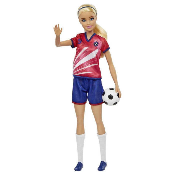 Get ready to celebrate one of kids' favourite sports with this Barbie® soccer doll! Inspired by a globally popular colour scheme, Barbie® soccer doll is 11.5 inches tall and wears a uniform consisting of a red shirt with white stripes, the number '9' and a team patch plus blue shorts, studded shoes and tall white socks. Barbie® soccer doll also features a blonde ponytail and comes with a soccer ball accessory. Doll cannot stand alone.