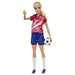 • Barbie Soccer doll sports a red shirt with white stripes, and the number '9'.