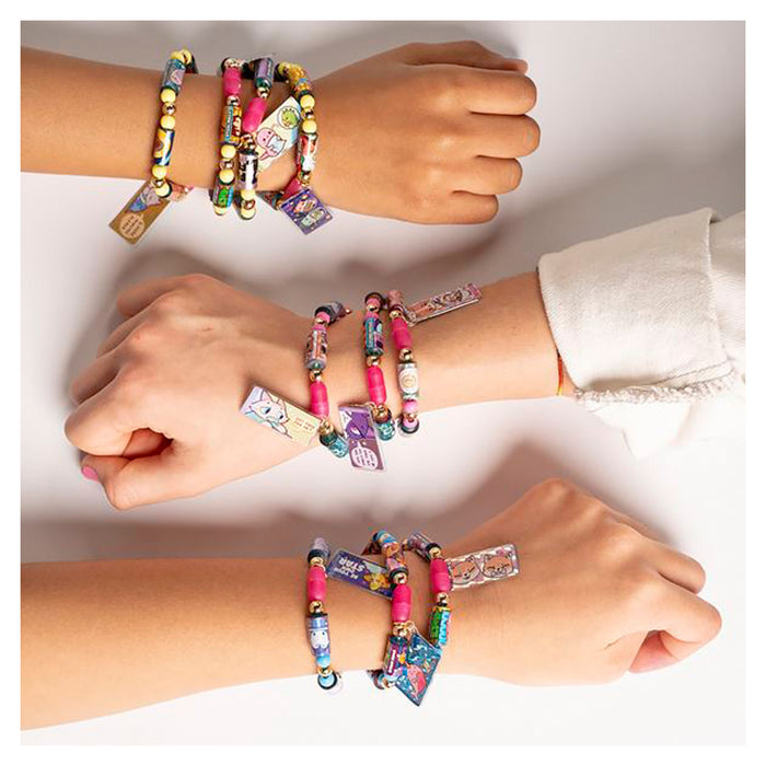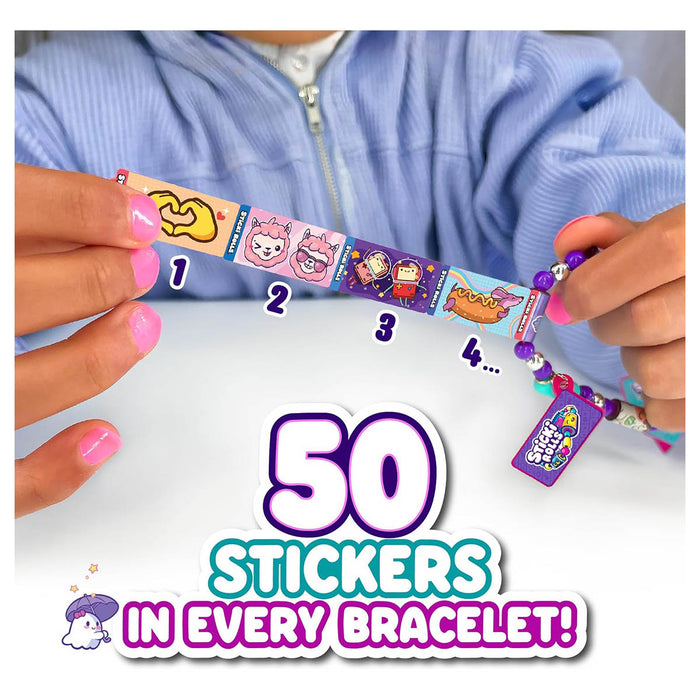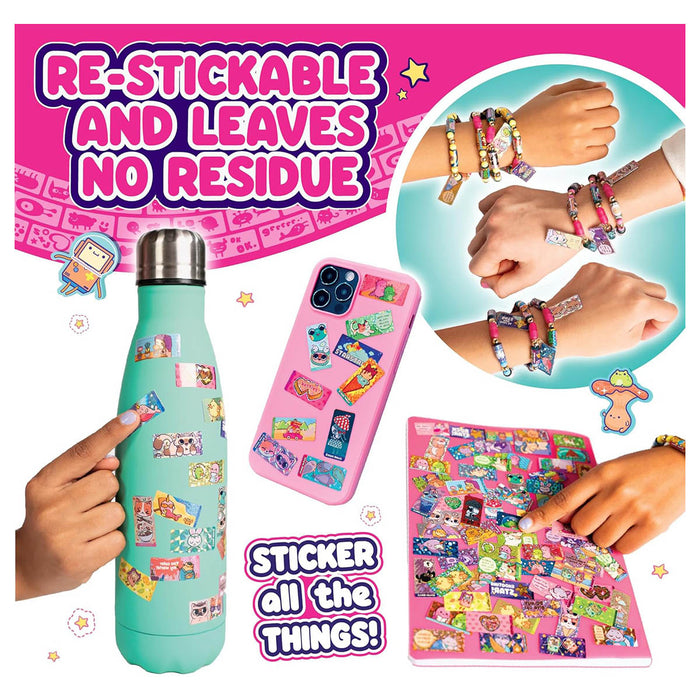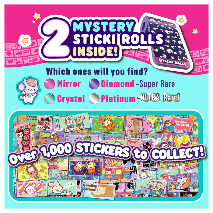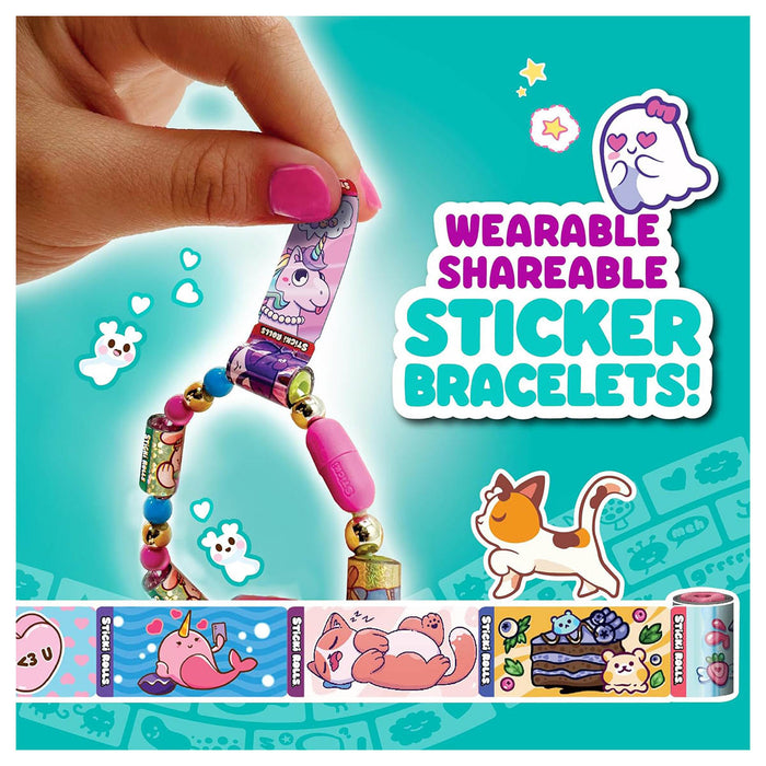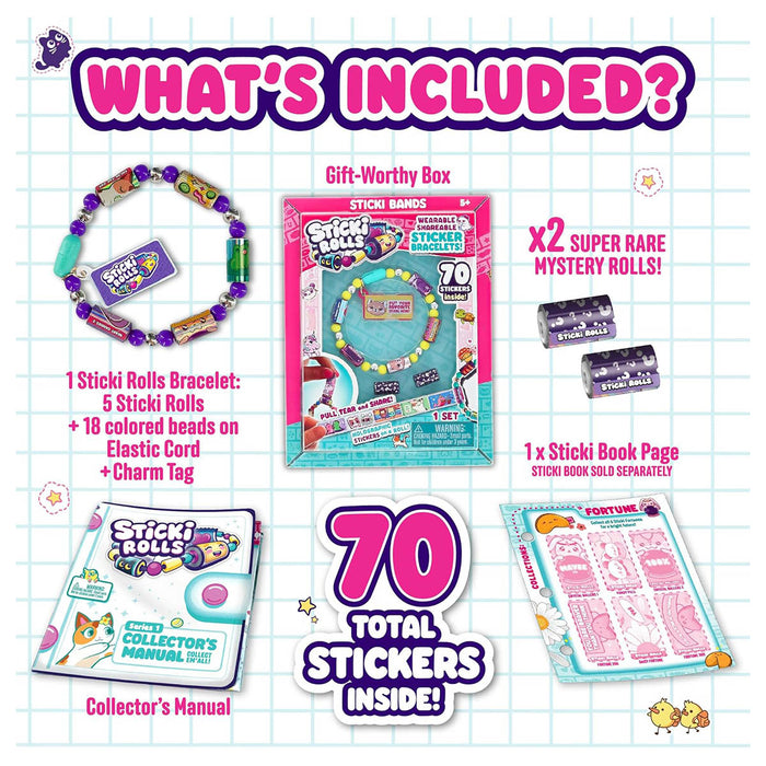 Introducing Sticki Rolls Sticki Bands, the first-ever wearable, shareable sticker bracelets! Each Sticki Band bracelet holds 5 rolls of stickers, each containing 10 unique, Kawaii-themed designs. Includes two additional MYSTERY REVEAL Sticki Rolls inside for a total of 70 Stickers! Decorate your phone, water bottle, or laptop, or trade them with friends to build your collections. With our unique Quick-Grip Clasp system, swapping out sticker rolls is a breeze, ensuring endless customization possibilities. Every Sticki Roll on your bracelet is actually a ROLL of 10 holographic mini stickers that you can pull, tear and share! Sticki Rolls are made of holographic foil (not like normal stickers) so they don't leave marks or gunk, even after months of being stuck! They're even restickable, in case you want to swap Stickies from your notebook to water bottle! Decorate your stuff, share with friends and build your collection!