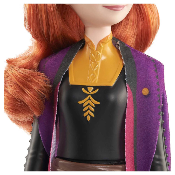 Meet this Anna doll, inspired by the fearless and optimistic heroine from Disney's Frozen II. This posable fashion doll is shown in her signature travel look, with accessories that include boots and a soft cape and skirt. In her signature outfit from the movie, this Anna doll is ready to embark on a journey far from home! Doll cannot stand alone.