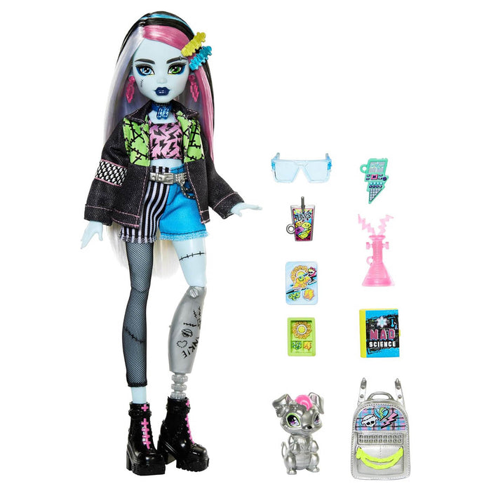 School is back in session, and the Monster High ghouls are showing up in scream-tastic style! Frankie Stein doll struts down the Monster High hallways in an electrifying fashion featuring a plaid skirt, lightning bolt-printed blouse and stitch-detailed vest. Their freaky-fabulous look is complete with chunky platform sneakers, creeperific accessories and a prosthetic leg and stitch details celebrating their unique style. Take Frankie Stein doll's look to the next level with a voltageous varsity jacket and electrifying accessories. Plus, inspire spooktacular storytelling with their creepy-cute pet dog, Watzie! Doll cannot stand alone.