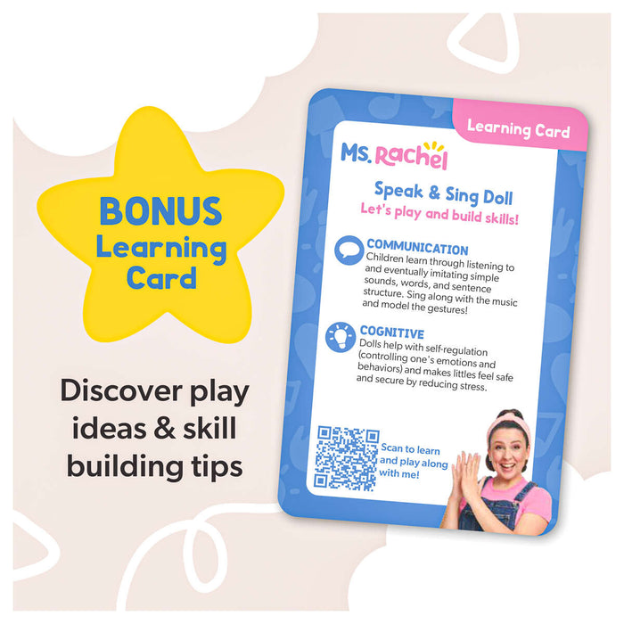 • Interactive touch-activated Ms. Rachel doll that plays 16+ signature phrases & 4 songs from the hit Ms. Rachel show.