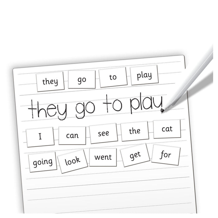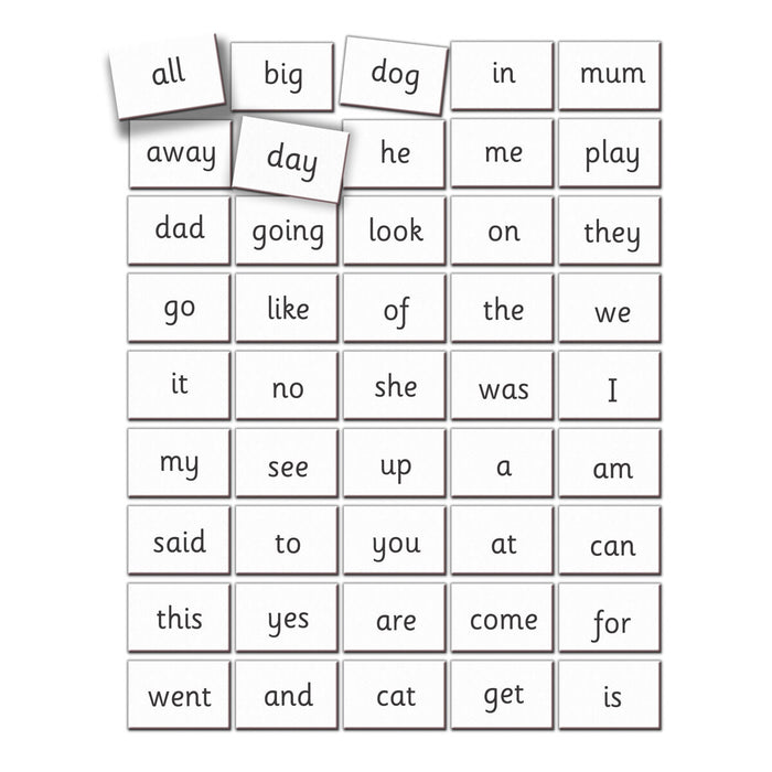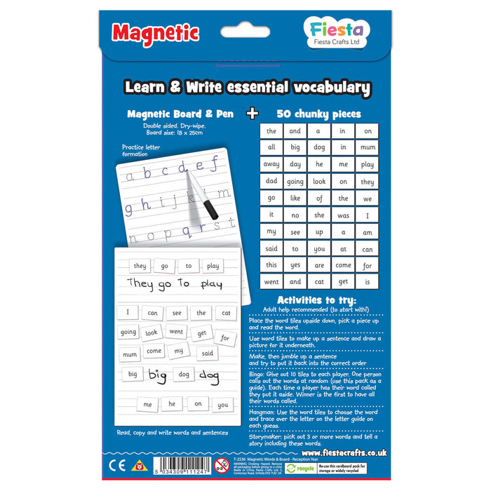 Fun to learn and write out the 45 High Frequency words taught in the Reception year and included in the National Literacy Strategy for the Early Years Foundation Stage. Chunky pieces are easy for little fingers to grip. Letter practice guide on reverse. Learn Words, make sentences, practice writing for class, at home or travel. Double-sided magnet board for reading, writing and storage. Children will love learning essential vocabulary and writing skills whilst playing with this set of 45 magnetic first words activity ideas. Place the word tiles upside down and take turns to pick a piece up and read the word. Use word tiles to make up a sentence and draw a picture for it underneath. Jumble up a sentence and try to put it back into the correct order. Bingo: Give out 10 tiles to each player. One person calls out the words at random (use this pack as a guide). Each time a player has their word called they put it aside. The winner is the first to have all their words called. Hangman: Use the word tiles to choose the word and trace over the letter on the letter guide on each guess.