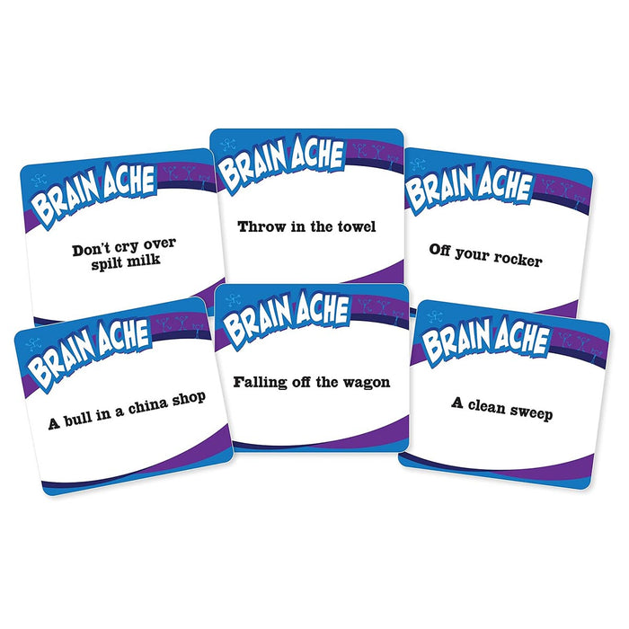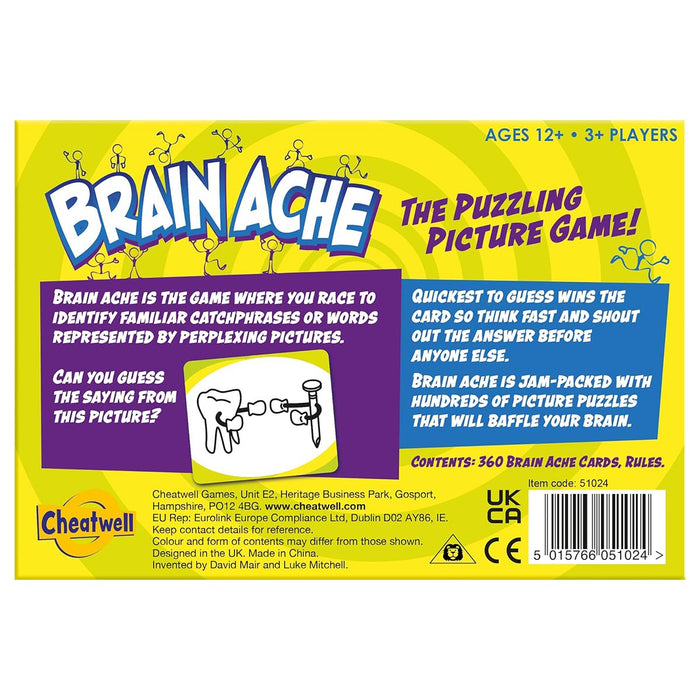 Brain Ache is the game where you race to identify familiar catchphrases or words represented by perplexing pictures. Quickest to guess wins the card - so think fast and shout out the answer before anyone else! Brain Ache is jam-packed with hundreds of picture puzzles that will baffle your brain.
