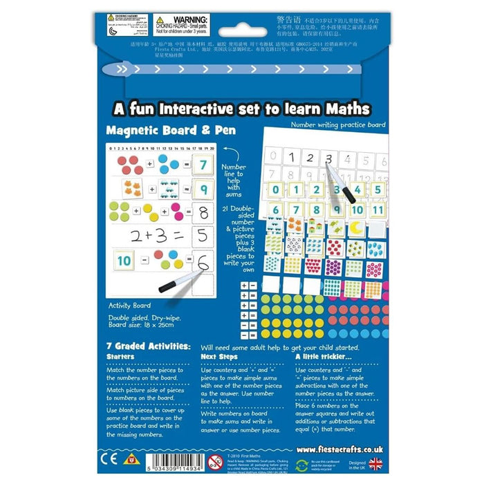 Learning to count and add/subtract is one of the first things children will do when they enter school years, and is a key component of Early Years/Foundation stage education. This First Maths set has been designed to support this stage by helping children to learn in a way which makes it as much fun as it is educational. This set includes magnetic picture pieces, a sums board, numbers and a counting board so that there are various visual aids to support and stimulate. Children can count pictures of familiar items like bananas or cars, which, by using fun illustrations, make it a more playful exercise than using numbers alone, and the inclusion of a dry-wipe pen to copy numbers helps make this an activity that can be repeated over and over again.
