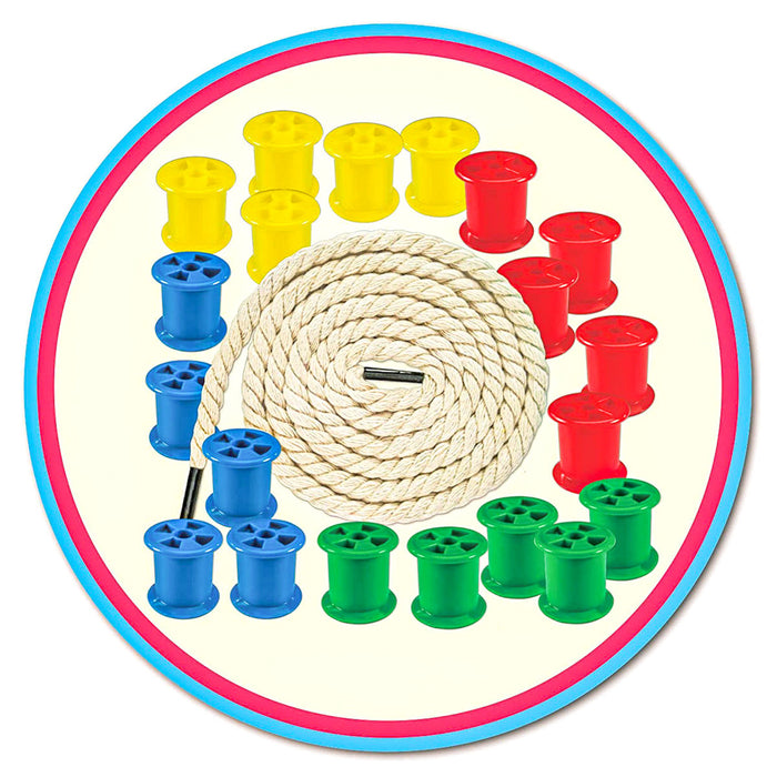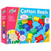 Set of 20 cotton reels in 4 bright colours plus a chunky threading cord. Ideal for threading and stacking to encourage hand/eye coordination and manual dexterity. Made from tough, durable plastic.