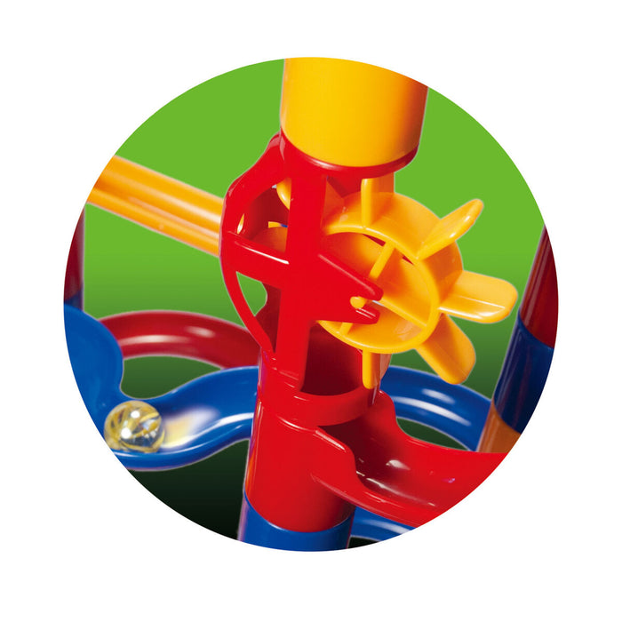 • Includes chutes, roundabouts, marbles, paddle wheel, step pass, tubes and much more.