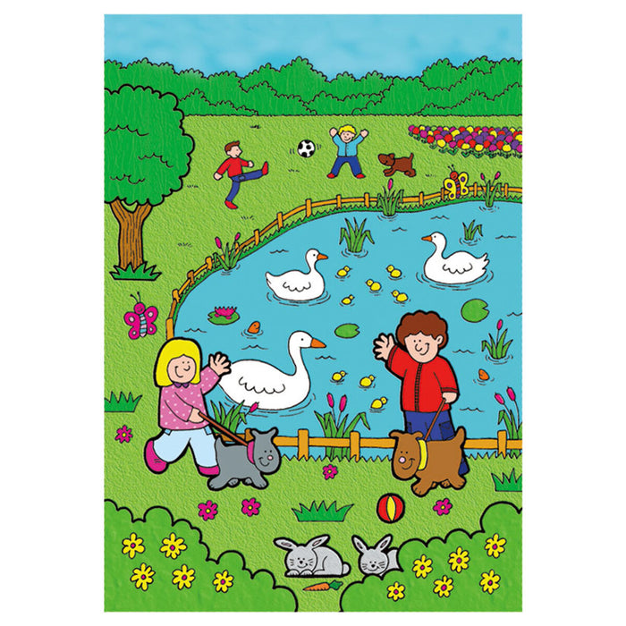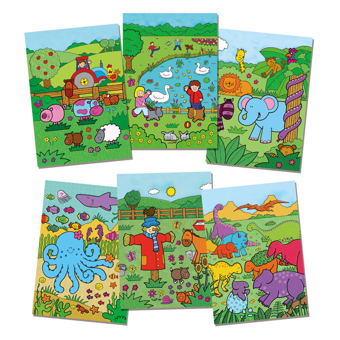 This chunky spiral pad features 6 reusable pictures to colour with the water pen. Fill the pen with water and use to reveal the hidden pictures. The coloured pictures will appear and later disappear over and over again. Ideal for travel.