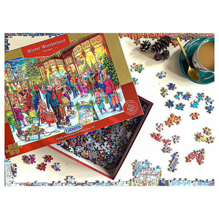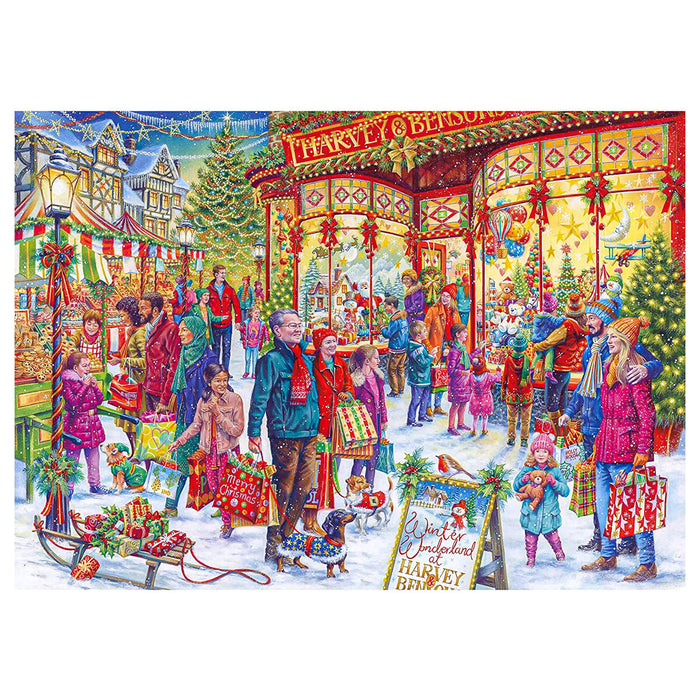 This magical 1000 piece jigsaw puzzle is the 20th in our extra special Christmas Limited Edition series. Peering into sparkling shop windows, perusing market stalls, and purchasing gifts for loved ones at Harvey and Benson’s, Winter Wonderland is the perfect way to prepare for the holiday season. You can almost smell the cinnamon and ginger of the mince pie stall deliciously hanging in the crisp air. And it’s not just the people’s faces that are lit up with Christmas joy - the little furry friends are also joining in on the Winter Wonderland merriment. Winter Wonderland is illustrated by Tony Ryan and packaged in a shiny, eco-foiled gold box and inside is a special, serial-numbered certificate to make it the ultimate collectors’ item.