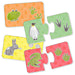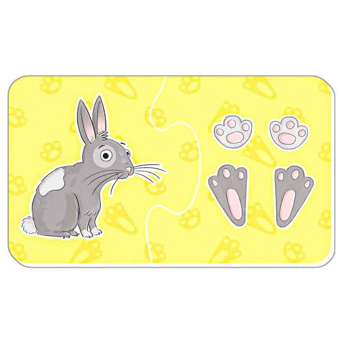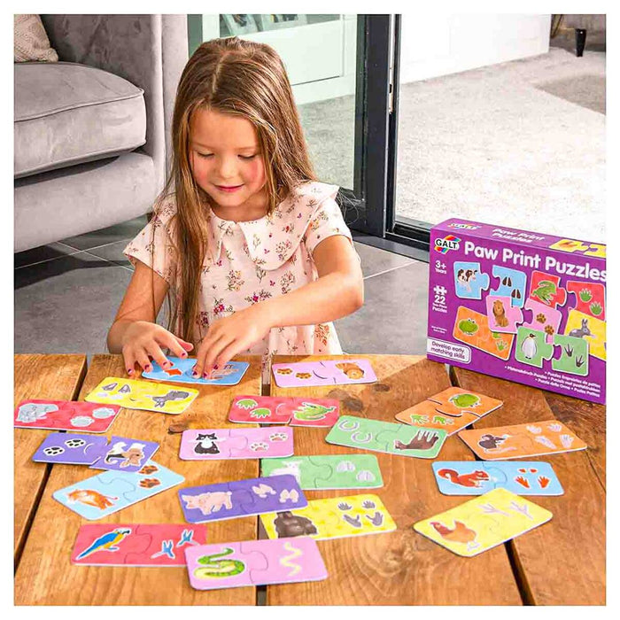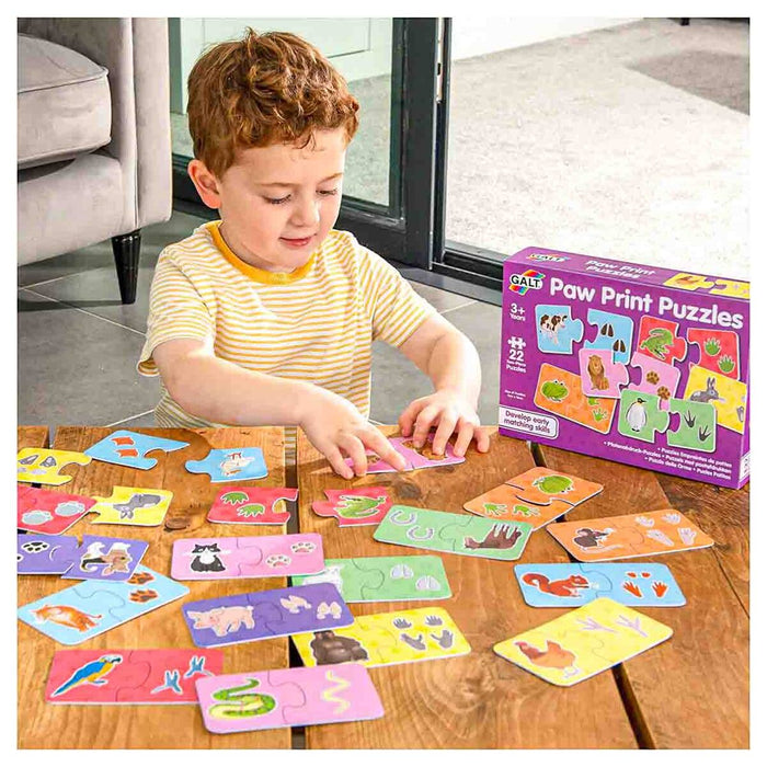 Paw Print Puzzles feature 22 wonderfully wild puzzles that will help your child develop early matching skills. Each paw-some two-piece puzzle features an animal to match to its footprints. The pieces are self-correcting so will only fit together when a matching pair is found. The easy-to-handle pieces are made with thick, quality board that has a wipe-clean surface for long-lasting fun.