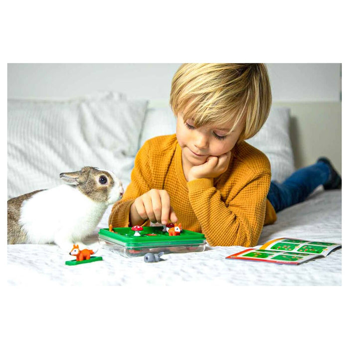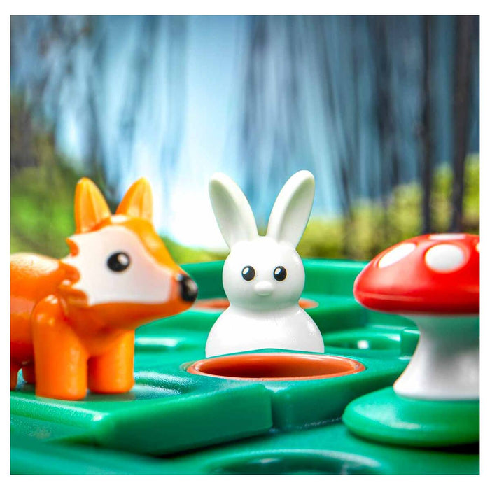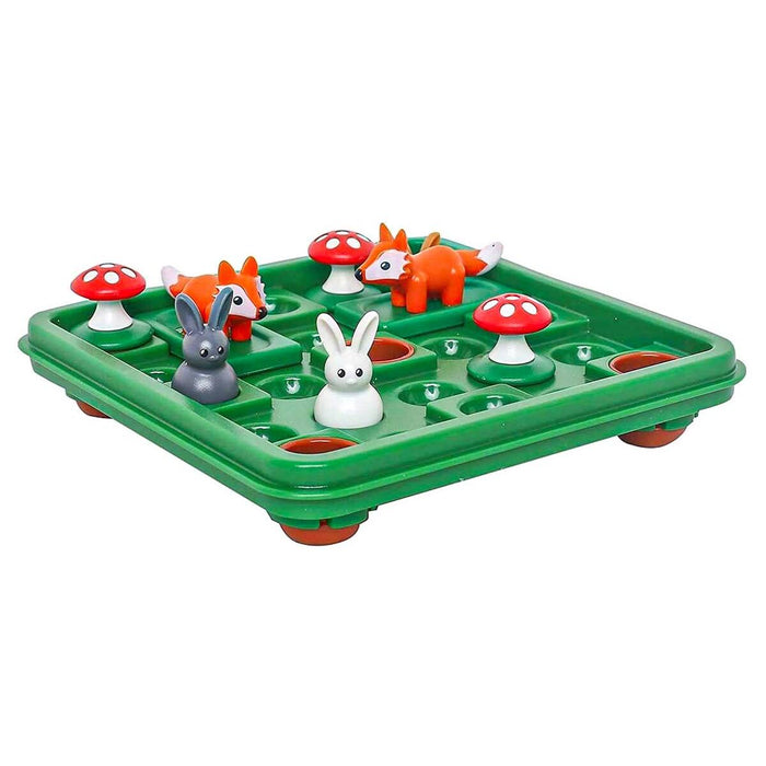 • Move the rabbits (jumping) and foxes (sliding) around the board until all of the rabbits are safe in their brown burrows.