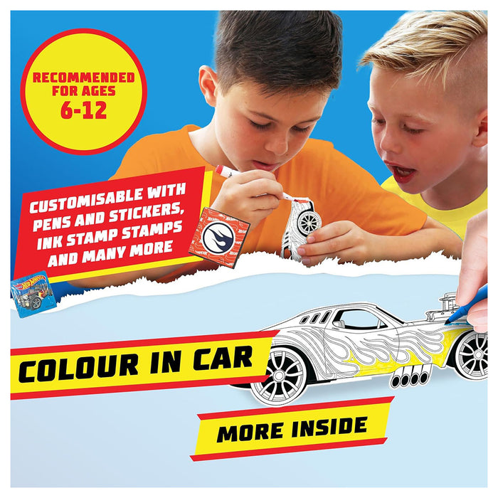 Get crafting with the 150 piece Hot Wheels Activity Set. The craft set includes foil sticker roll, colour-in sheets, mini felt tip pens, colour in card car, ink stampers, sticker rolls, activity sheets and more!Unleash your child's imagination with the customisable cut-out car included in this set. They can design their unique Hotwheels racer, making it track-ready for endless racing adventures and creative play. Contents: 150x sssorted craft items, 1x foil sticker roll, 2x colour-in sheets, 4x mini felt tip pens, 1x colour-in card cars, 2x ink stampers, 1x ink pad, and 3x mini sticker rolls.