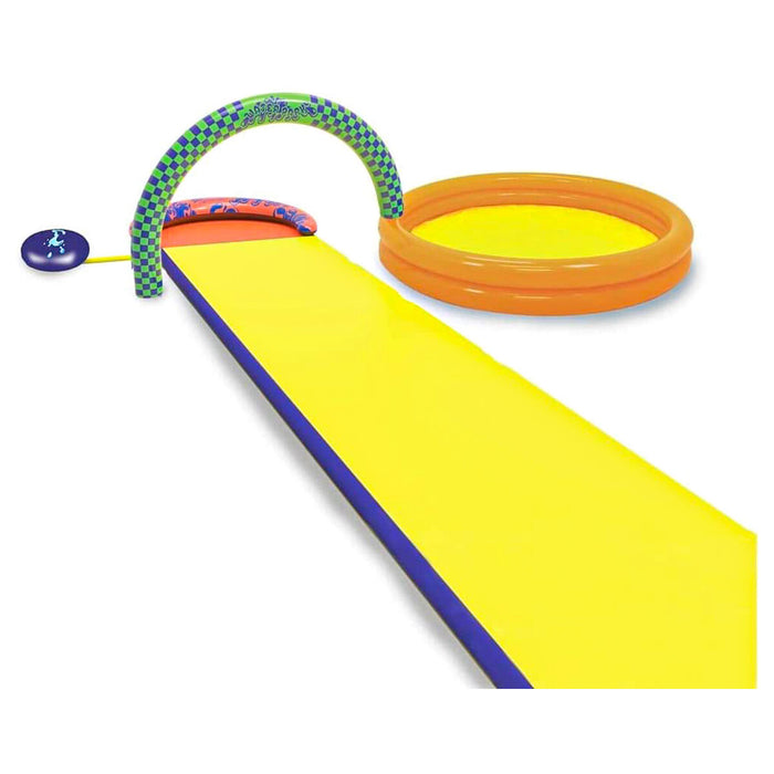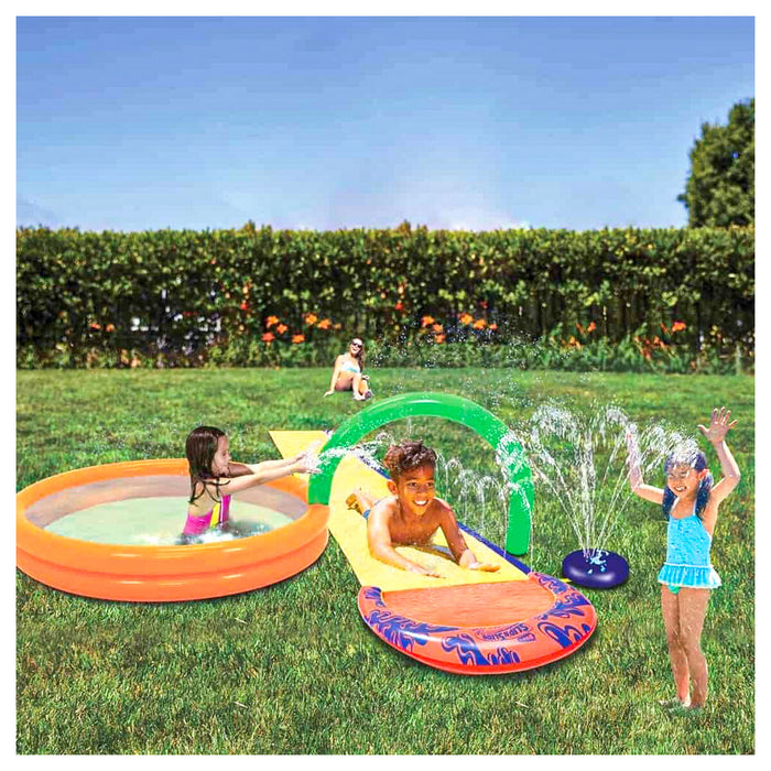• Includes an original 4.9m Slip 'n' Slide, a paddling pool and a water-jet sprinkler pod!