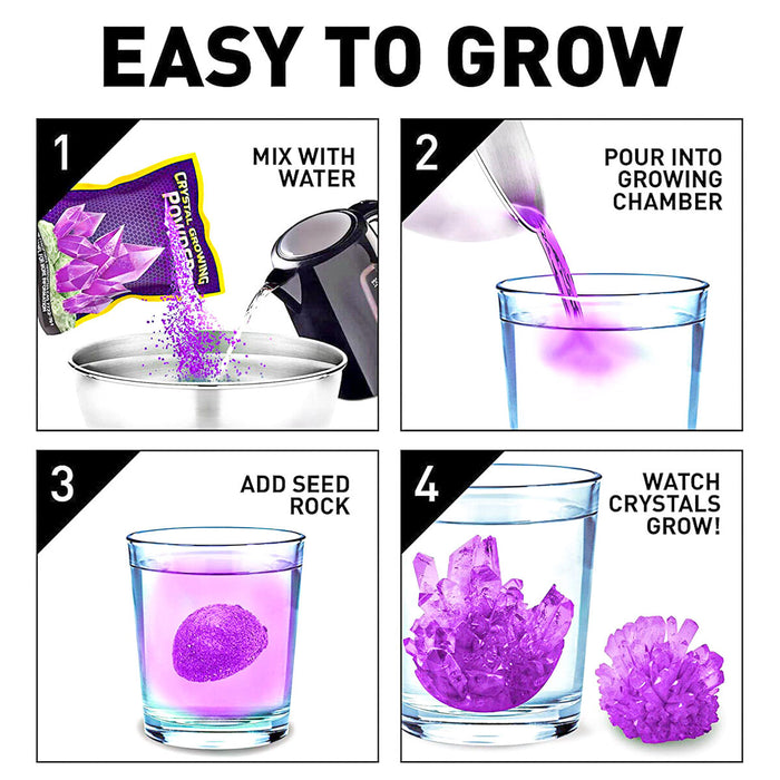 • Simply mix the crystal powder with water, pour into the growing chamber, add seed rock then watch your crystals grow!