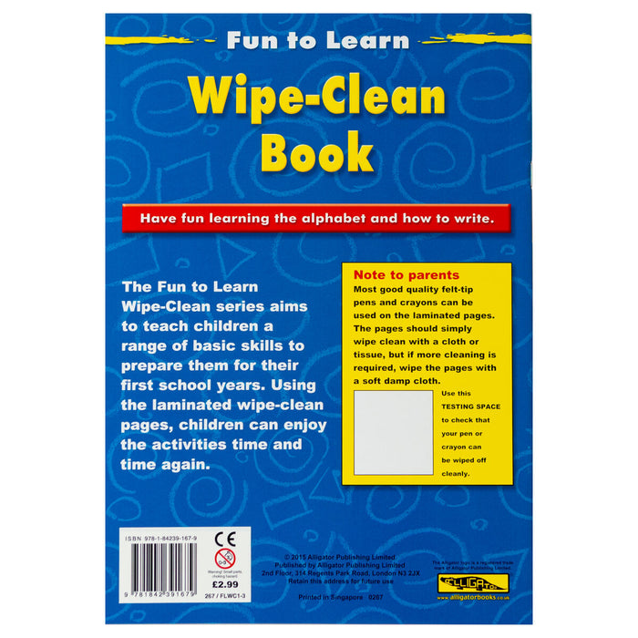 The Fun to Learn Wipe Clean series aims to teach children a range of basic skills to prepare them for their first school years. Using laminated wipe-clean pages, children can enjoy the activities again and again. Letters and writing fun for 4 -5 year old, wipe-clean reusable book. The beginner's wipe-clean workbook provides a fun way to introduce letters. The pages begin with easy words and build up to more complicate words and exercise. Answers can be written in crayon, felt tip or washable marker pens and then wiped clean so the pages can be used again.