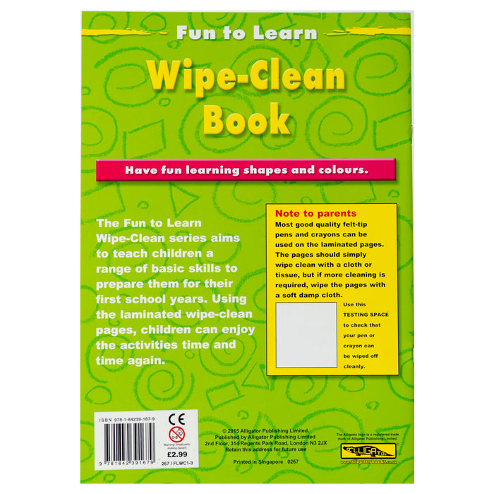 The Fun to Learn Wipe Clean series aims to teach children a range of basic skills to prepare them for their first school years. Using laminated wipe-clean pages, children can enjoy the activities again and again. The beginner's wipe-clean workbook provides a fun way to introduce shapes. The pages begin with smaller shapes. Answers can be written in crayon, felt tip or washable marker pens and then wiped clean so the pages can be used again.