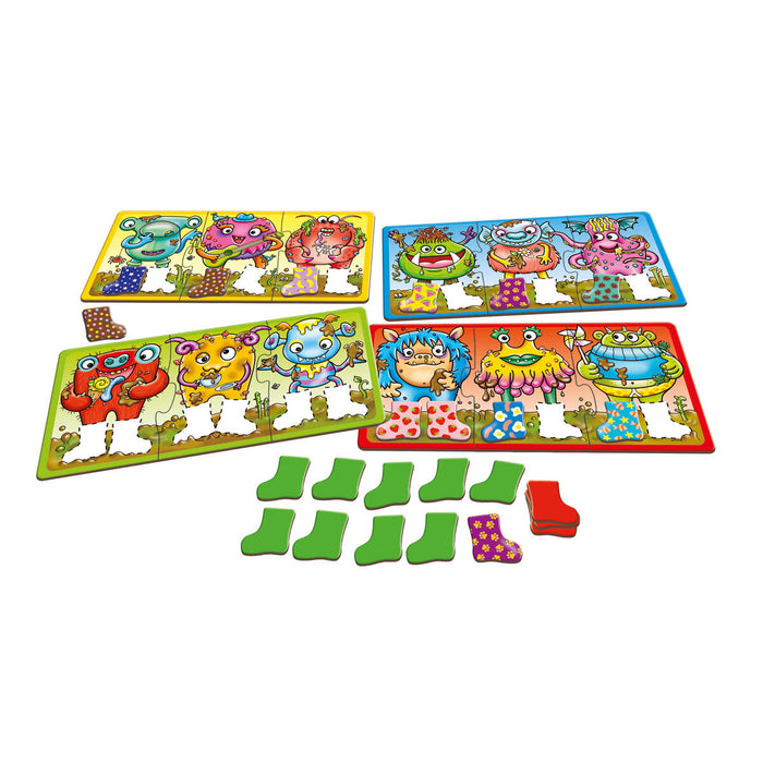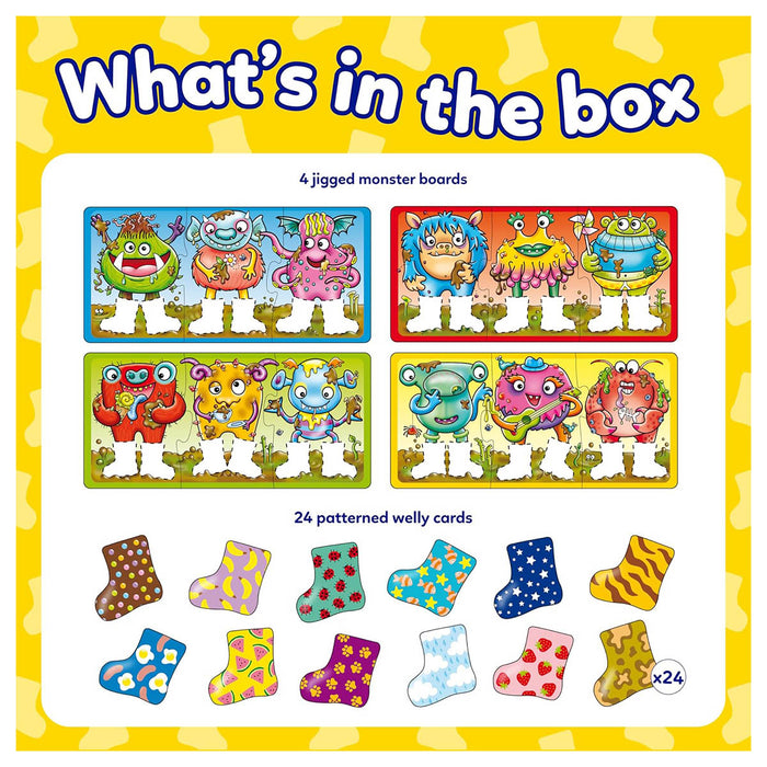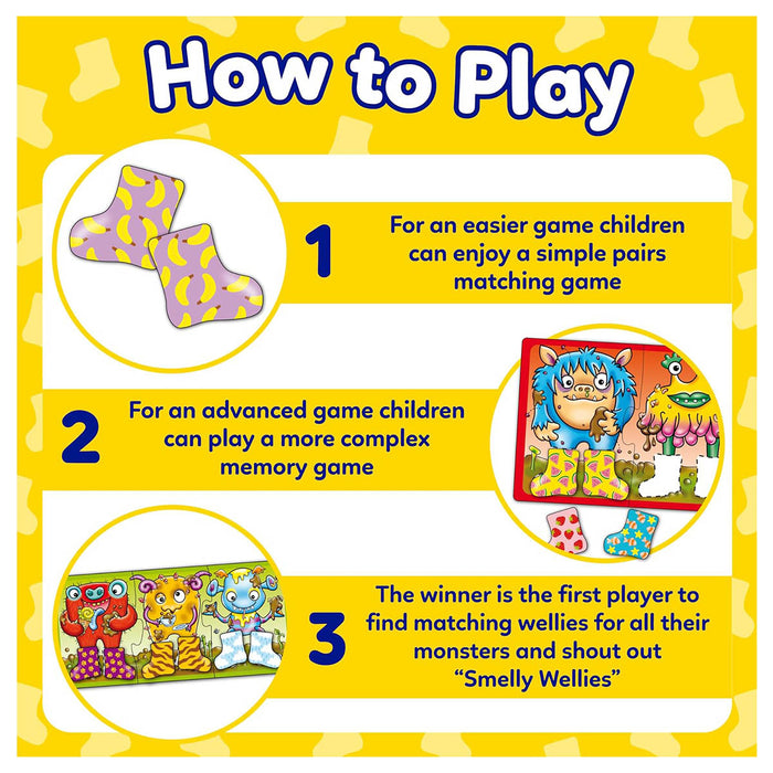 The fun and simple matching game Smelly Wellies where players turn over welly cards to find matching patterned wellies for their monsters. The quirky monster characters are bound to get children giggling!. There are two ways to play this colourful game, as a simple matching pairs game for younger players and a more challenging memory game as children progress!