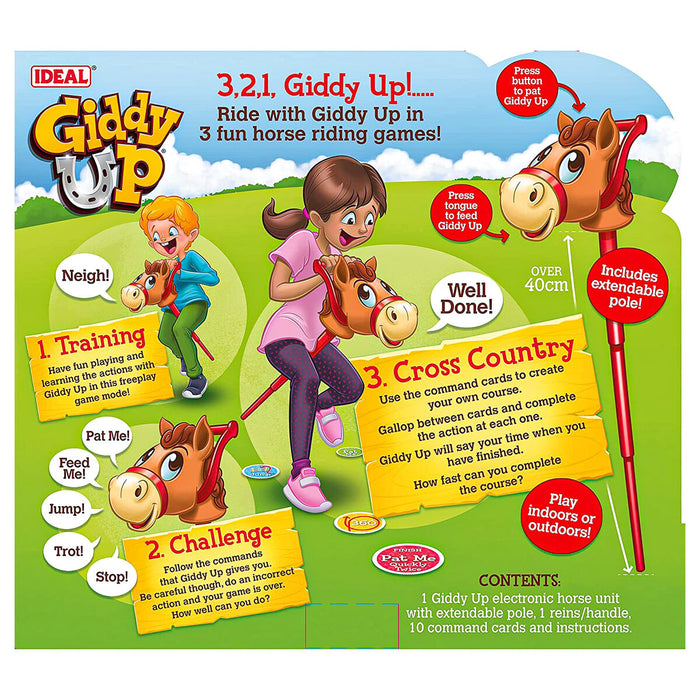 In Training, get used to Giddy Up with this free play game mode. In Cross Country, place the 10 command cards in an open space and Giddy Up. When you reach the card, do the command and then gallop to the next. How fast can you complete the track that you set? In Challenge, follow the commands that the horse gives you. Be careful though, do an incorrect action and your game is over. How well can you do?