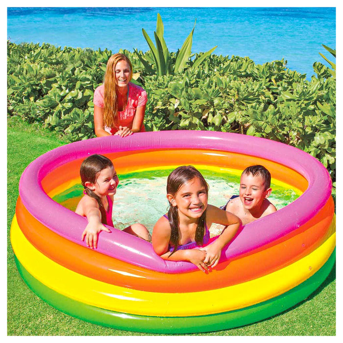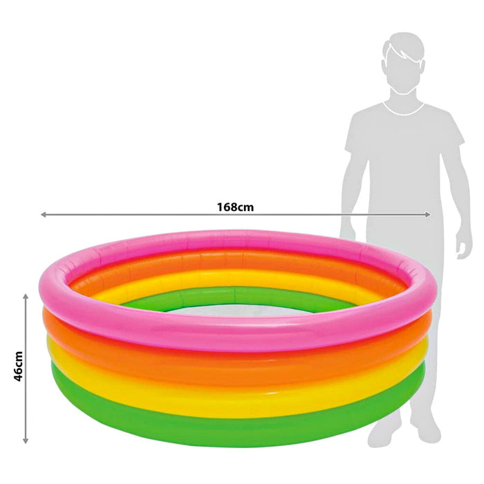Designed with 4 bright, colourful rings and a comfy inflatable floor, the Intex Inflatable Sunset Glow Paddling Pool sets up easily in the backyard for loads of splash-filled fun. Includes a drain plug for easy emptying. Inflated size: 168 x 46cm.
