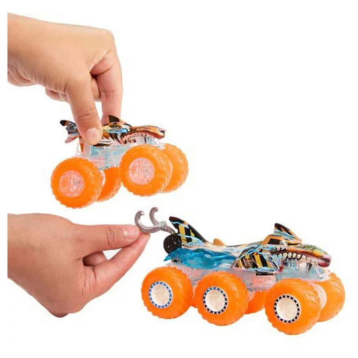 The Hot Wheels Monster Trucks Power Smashers Truck & Big Rig Multipack pairs up fan-favourites Tiger Shark and Mega-Wrex with their corresponding Big Rig for epic destruction. Each 1:64 scale toy truck and its larger counterpart features the bright and electric Powers Smashers deco that takes the smashing and crashing up a level just like in the YouTube Kids series! Tow Tiger Shark behind its Big Rig and load Mega-Wrex atop its Big Rig, then head into big-time battle! With special Power Smashers packaging, this multipack is revved up for play or display.