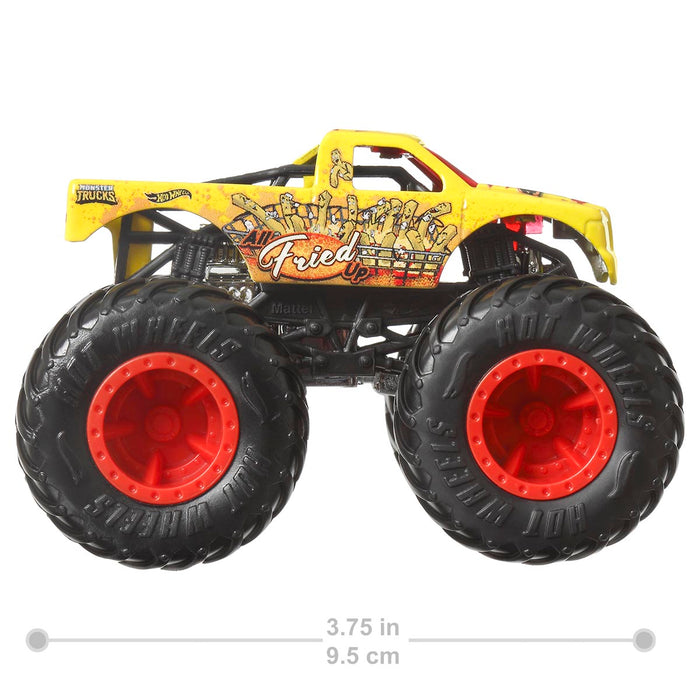 The Hot Wheels Monster Trucks All Fried Up 1:64 scale die-cast vehicles are primed for epic smashing and crashing. Each metal toy truck has awesome designs and giant tires and includes a crushable car. The packaging has the truck's name, truck type, strength, unique crash attack and motor-vation!