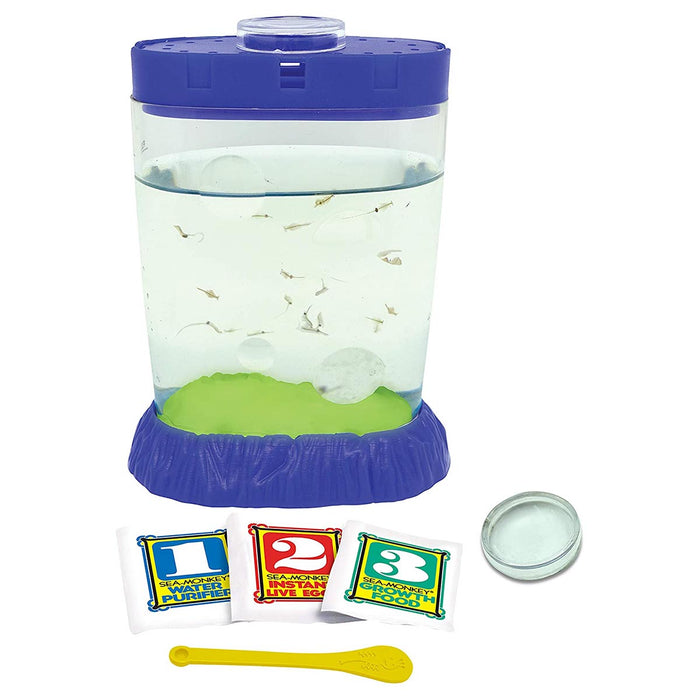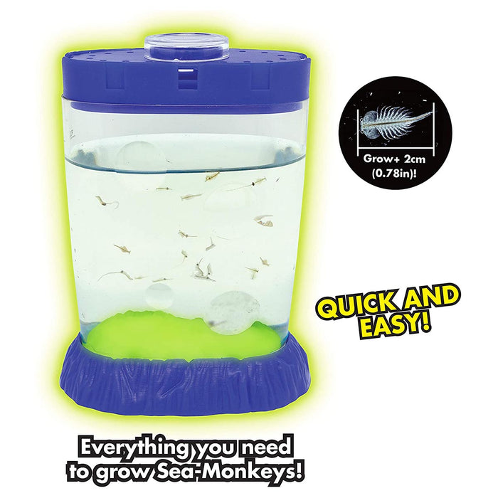 Watch your Sea-Monkeys day AND night with the MagiQuarium magical glow in the dark tank. See how these tiny crustaceans are attracted to the MagiQuarium's glow. Sea-Monkeys are an educational living science experiment that kids and adults have loved ever since they were created. Activating the eggs is a valuable opportunity to learn from seeing biology in action, and fascinating to watch for all ages. Once your Sea-Monkeys hatch you will be able to observe their full life cycle in real time, watching them grow as you feed them. Includes tank, water purifier, instant live eggs, food, aquarium, feeding spoon; just add water!