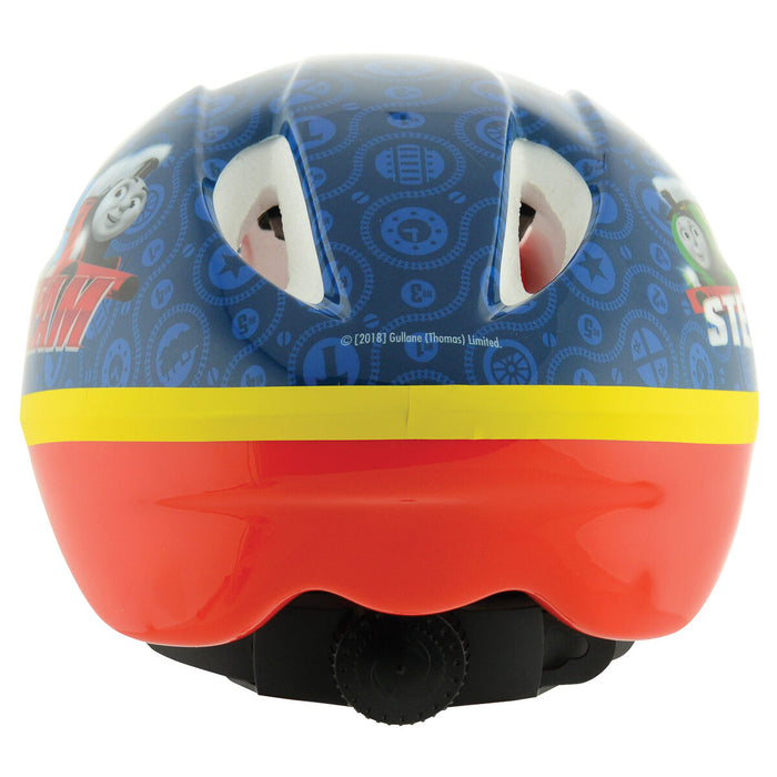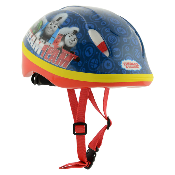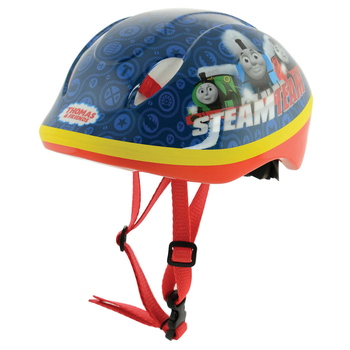 Thomas Safety Helmet ideal for biking, skating and scootering. Decorated with character favourites, Thomas, James and Percy. Comes with adjustable size dial 48-54cm. Quick release buckle. Adjustable straps. Ventilated shell. Removable foam padding for adjustable comfort and fit. Lightweight EPS inner. All over character print. To fit head size 48-54cm.