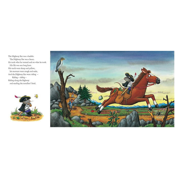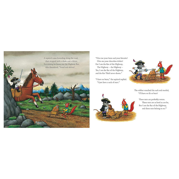 Life is not safe for the other animals, as the villainous HighwayRat gallops along the highway, stealing their food. Clover from a rabbit; nuts from a squirrel - he even steals his own horse's hay. Then he meets his come uppance, in the form of a cunning duck. A fabulous, rollicking rhyme, in the style of the Alfred Noyes poem, 'The Highwayman'.
