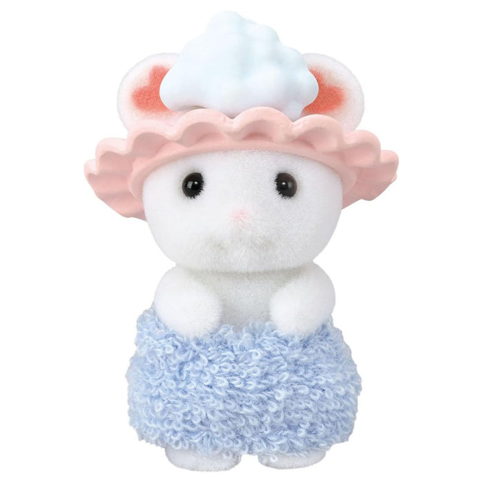 Bathtime is fun with this set that includes the Marshmallow Mouse boy and cradled baby with various bath accessories. The matching accessories include a baby bath, floor standing shower, bath toys and shower caps. The shower caps and bubbles can be placed on the figures' heads. The adorable bottles and soap are shaped like the Marshmallow Mouse figures. The soap can be placed in the soap tray of the shower and the bottles and bath toys can be placed in the rack. The boy and cradled baby are wearing outfits made from soft towelling material.