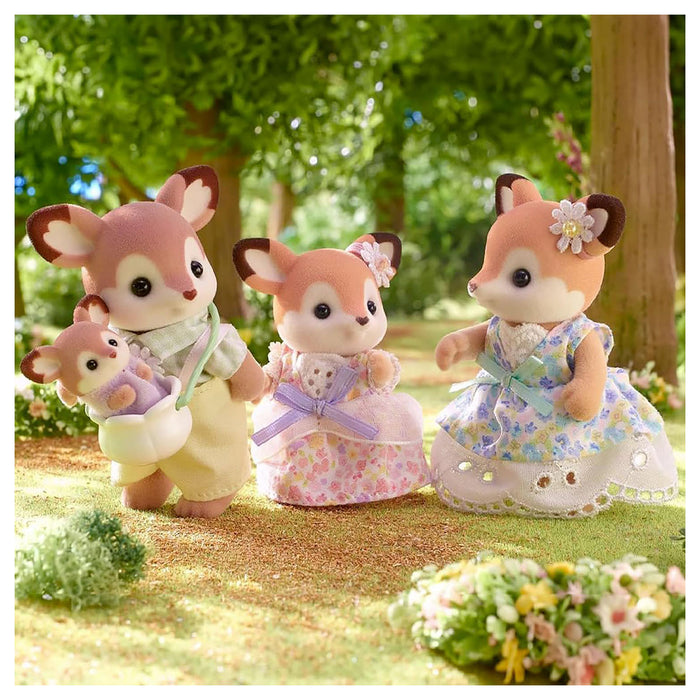 This set contains the Deer family in matching floral outfits. It includes the father, mother, girl and cradled baby with a sling. The figures have different colours and ear patterns! You can put the cradled baby in the flower bucket sling. The father and cradled baby are cocoa-coloured with petal-patterned ears, while the mother and girl are caramel-coloured with flower ear decorations. The grown-ups can carry the cradled baby in the flower bucket sling. Combine with the Deer Babies - Floral Swing Set, Deer Twins and Nursery Princess Play Set (sold separately) for even more fun imaginative playtime with the whole family!