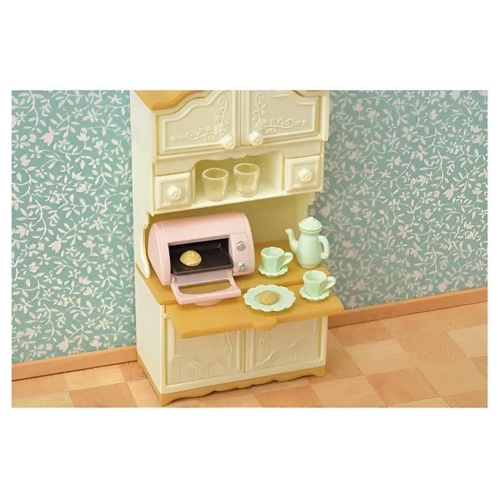 • Features a tea set and toaster oven that can be stored in the kitchen cabinet.