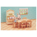 Dining Room Set includes a dining table and baby chair suitable for up to 5, and a delightful kitchen cabinet for storing kitchenware. Dining Room Set features a tea set and toaster oven that can be stored in the kitchen cabinet. The dining table comes with 4 chairs for both adults and children, and a baby chair. Includes: 1 x Kitchen Cabinet, 2 x Drawers, 1 x Toaster Oven, 1 x Toaster Oven Tray, 2 x Cookies, 1 x Plate, 1 x Pot, 1 x Lid, 2 x Cups, 2 x Saucers, 2 x Glasses, 1 x Dining Table, 4 x Chairs, 1 x Baby Chair (a total of 22 pieces).