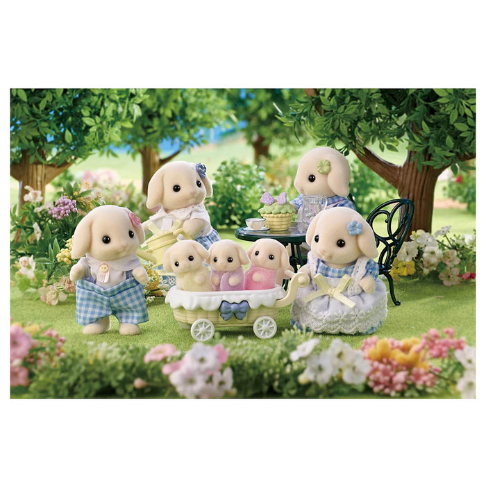 Meet the Flora Rabbit Family! They love flowers, have adorable droopy ears, and come with a beautiful baby carriage you can put the babies in to go for a lovely walk in nature! Aria, the Flora Rabbit mother, is a wonderful singer and piano player. She's a teacher at the nursery school - the babies love how kind she is and how much fun they have with her. She can't draw well at all, though! Nolan, the Flora Rabbit father, is a gentle type who'll make herbal tea for anyone. He talks to his plants so much that the children think the flowers can really understand him! The triplets' names are Rosemary, Thyme and Sage.