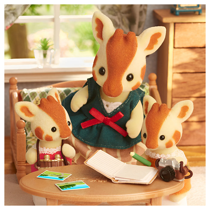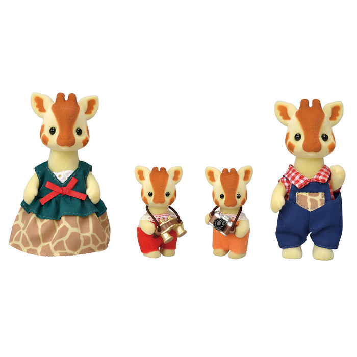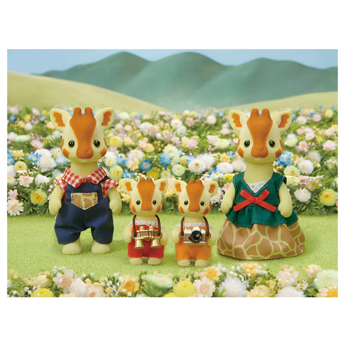 Sylvanian Families Highbranch Giraffe Family Set contains four figures: father Egbert, mother Olive, and babies Bran and Brie. Includes a camera and pair of binoculars for the babies. The figures' arms and legs can be moved to put them in different poses. Giraffe father Egbert keeps on forgetting how tall he is, so he is always hitting his head on things. Mother Olive is very easy going. Bran, the baby in orange, loves to take photos with the camera his father gave him. He really looks up to his tall father, in more ways than one! Brie, wearing red, likes to use the binoculars her father gave her. She's always begging her mother to let her ride on her head so she can see farther and farther away.