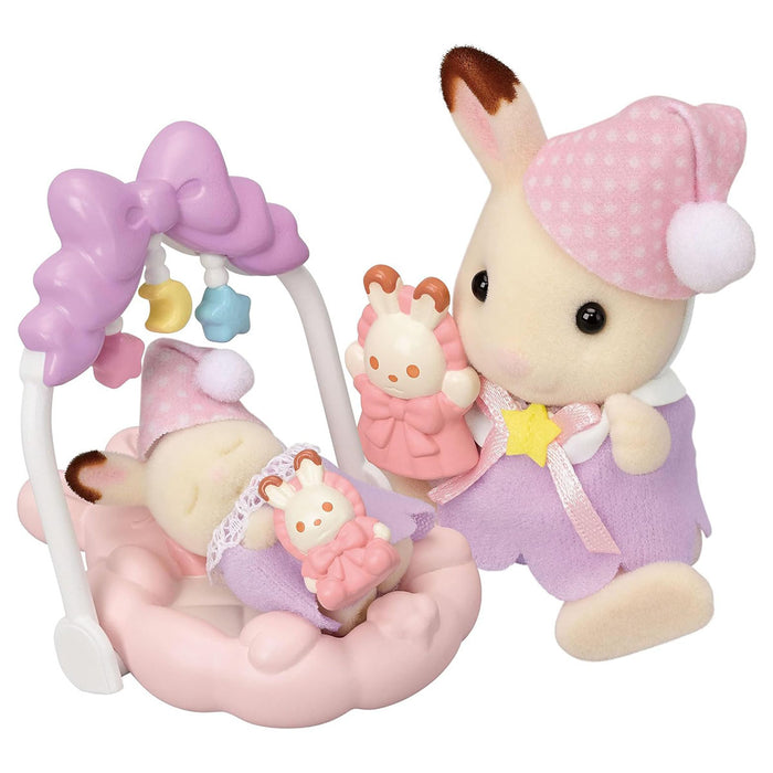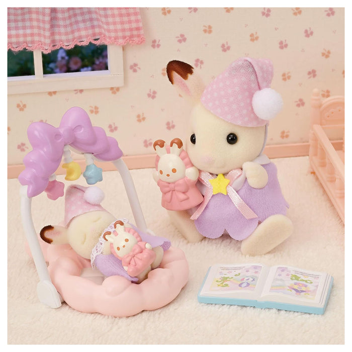 Bedtime is fun with this set that includes the Chocolate Rabbit girl and cradled baby with a baby gym and matching accessories.The adorable baby gym with a mobile will lull the cradled baby to sleep. The Chocolate Rabbit cradled baby has a special sleeping design with her eyes closed. The girl and cradled baby are wearing matching pajamas with night caps.The puppet can be placed on the girl's hand. Combine with other figures, houses, and furniture (sold separately) for even more fun imaginative playtime!