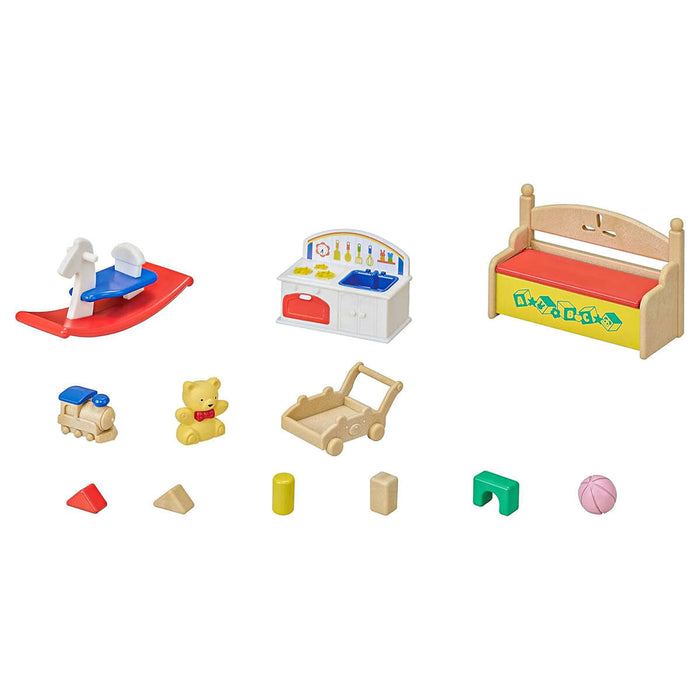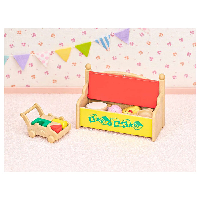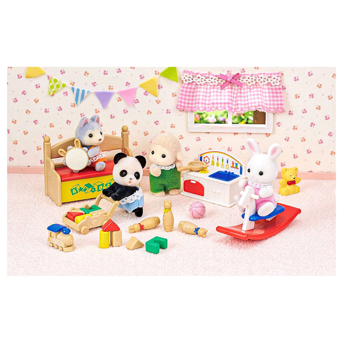 Baby's Toy Box Snow Rabbit & Panda Babies is colourful set featuring Snow Rabbit baby and Pookie Panda baby (crawling). Also includes plenty of toys for the babies to play with, including dolls and bowling pins. This set includes figures and accessories and can be played with on its own. The bench seat can be opened up and used to store the toys. The building bricks can all fit in the cart, nice and tidy! Or combine with houses such as the Red Roof Country Home (sold separately) for even more imaginative playtime!