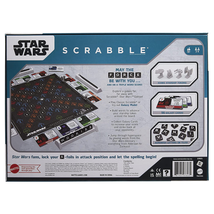 Launching gaming excitement into hyperspace, the Scrabble Star Wars Edition features two different ways to play! Classic Scrabble: Play tiles from your rack to form crossword-style words. In addition to the standard alphabet letters, the tiles in this version of the game include Aurebesh characters - the alphabet of the Star Wars galaxy! Galaxy Mode: the game launches into hyperdrive, with galaxy cards, starship tokens and a whole new way to play. The words you build allow you to move one of four iconic starship tokens - the Millennium Falcon, Boba Fett's starship, an X-wing, or a TIE fighter around the board. As players navigate their starship around the board, they can collect Galaxy Cards to increase their score and strike back at opponents!