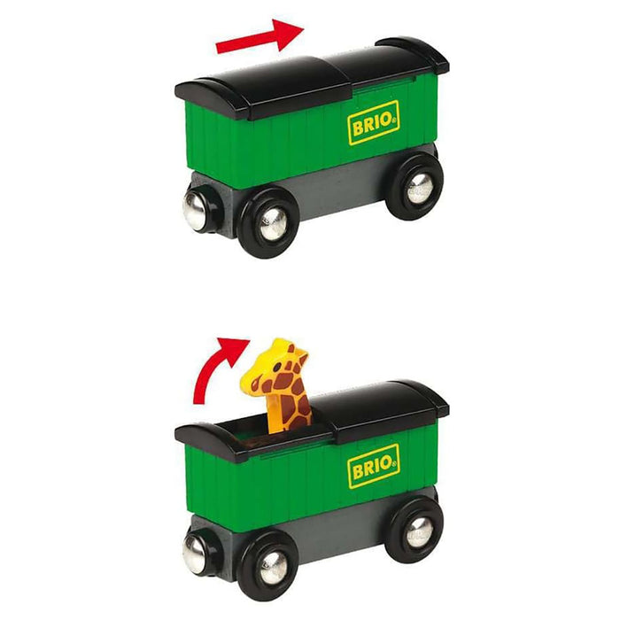 The BRIO Safari Train is a colourful train set with a cute surprise effect. The set comes with one yellow engine with fun safari print and two wagons carrying the attached giraffe and zebra. Slide the wagon roof open and the safari animals will quickly pop their heads up to say hi. Slide the roof closed again and they’ll tuck back down into the wagon.