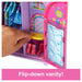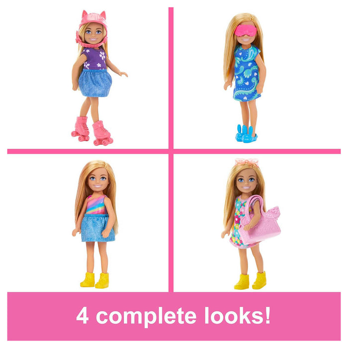 It's time to get ready with Chelsea doll! Open up this closet playset to reveal a dreamy wardrobe packed with 15 pieces of clothes and accessories. Mix and match outfits to create four complete looks! With fun pieces like dresses, a kitty bike helmet, heart-shaped sunglasses, bunny slippers, and a sleep mask - kids can dress Chelsea doll from morning to night! Doll cannot stand alone.