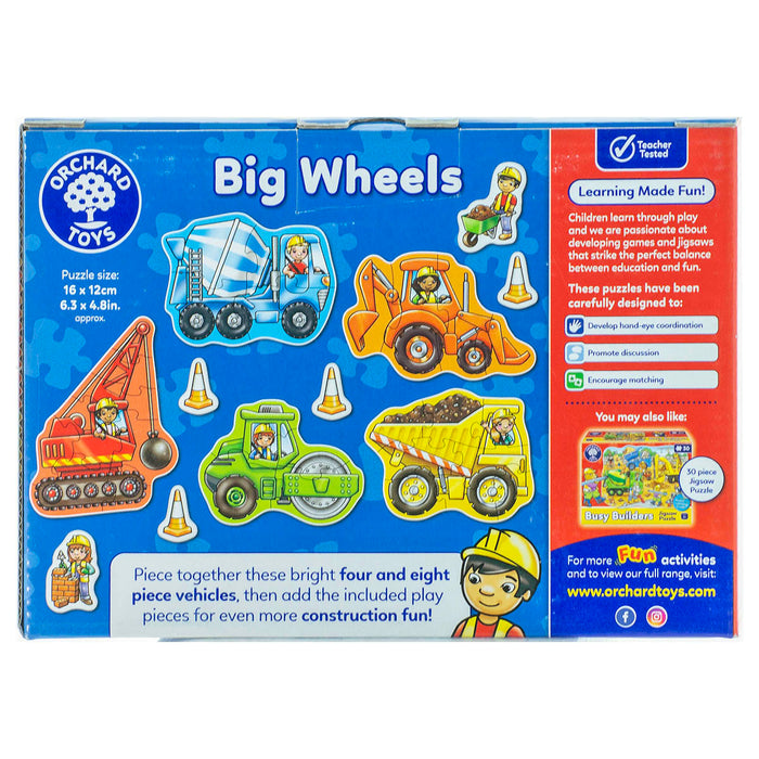 Children will love looking at the big, brightly coloured machines in Big Wheels. Each vehicle puzzle is made up of either 4 or 8 pieces, so very simple for little fingers. There is a bright green and yellow cement mixer, a yellow excavator, a blue bulldozer and a red digger, each with a cheerful driver waving from the cab. As well as the four vehicles, there are 8 additional play pieces, so children can create little scenes with the different elements; these include a wheelbarrow, two traffic cones, two piles of bricks, a pile of sand with a spade, a barrier, and a bucket and trowel. The puzzles are made with durable, thick card with a wipe-clean surface, so they will withstand plenty of handling. Children can be encouraged to talk about the different vehicles and the jobs they do, so helping with their vocabulary skills. Each puzzle is approximately 19 x 14cm.